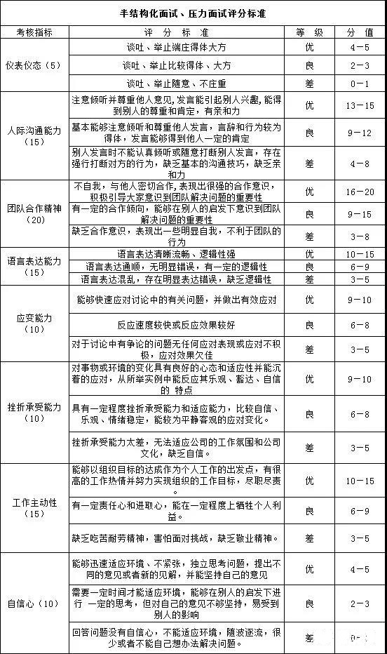 10、湖北:采取結(jié)構(gòu)化面試,面試內(nèi)容包括綜合面試題(考查應(yīng)聘者溝通表達(dá)能力、邏輯思維能力、臨場應(yīng)變能力、人崗匹配等)和專業(yè)面試題(考查應(yīng)聘者專業(yè)知識、技能及其應(yīng)用等)。