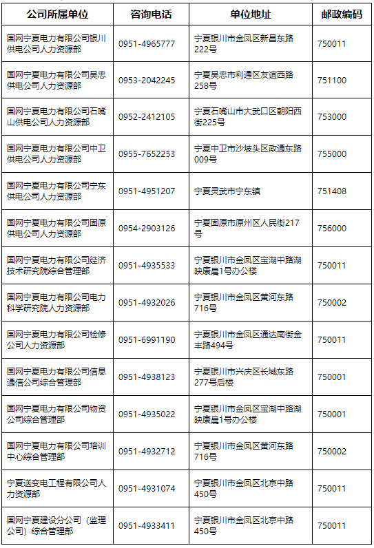 國網(wǎng)寧夏電力有限公司所屬各單位招聘咨詢電話及地址