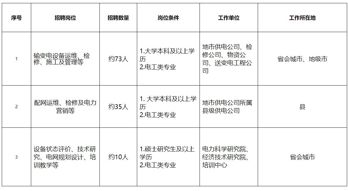 3.本批次(第一批)招聘專業(yè):電工類專業(yè)。優(yōu)先招聘研究生及以上學(xué)歷畢業(yè)生。錄用畢業(yè)生招聘崗位為生產(chǎn)一線技能崗位,并在分配的單位和生產(chǎn)崗位工作滿足一定年限后,方可參加技術(shù)、管理崗位競聘或申請跨單位調(diào)動(dòng)。